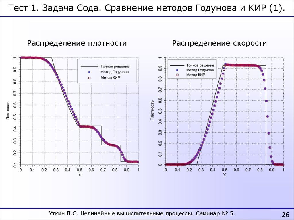Тест 1. Задача Сода. Сравнение методов Годунова и КИР (1).Распределение плотности