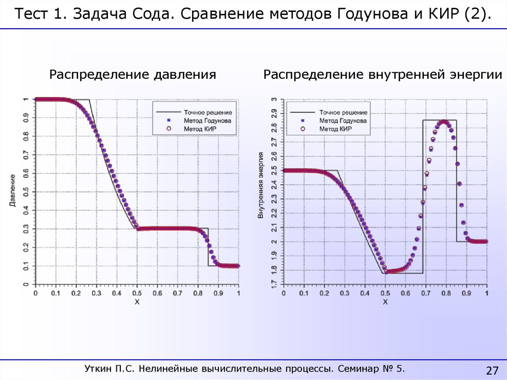 Тест 1. Задача Сода. Сравнение методов Годунова и КИР (2).Распределение давления