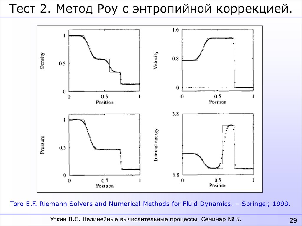 Тест 2. Метод Роу с энтропийной коррекцией.Toro E.F. Riemann Solvers and Numerical Methods for Fluid Dynamics. – Springer, 1999.