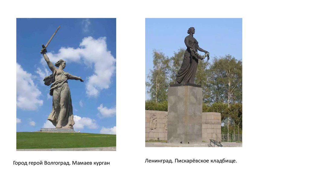 Город герой Волгоград. Мамаев курганЛенинград. Пискарёвское кладбище.