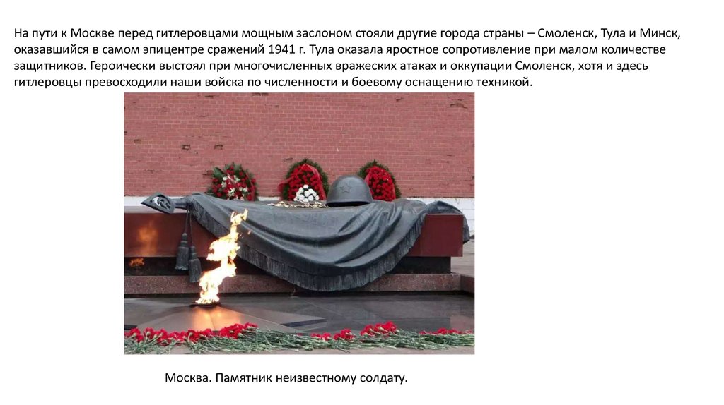 На пути к Москве перед гитлеровцами мощным заслоном стояли другие города страны – Смоленск, Тула и Минск,оказавшийся в самом эпицентре сражений 1941 г. Тула оказала яростное сопротивление при малом количестве