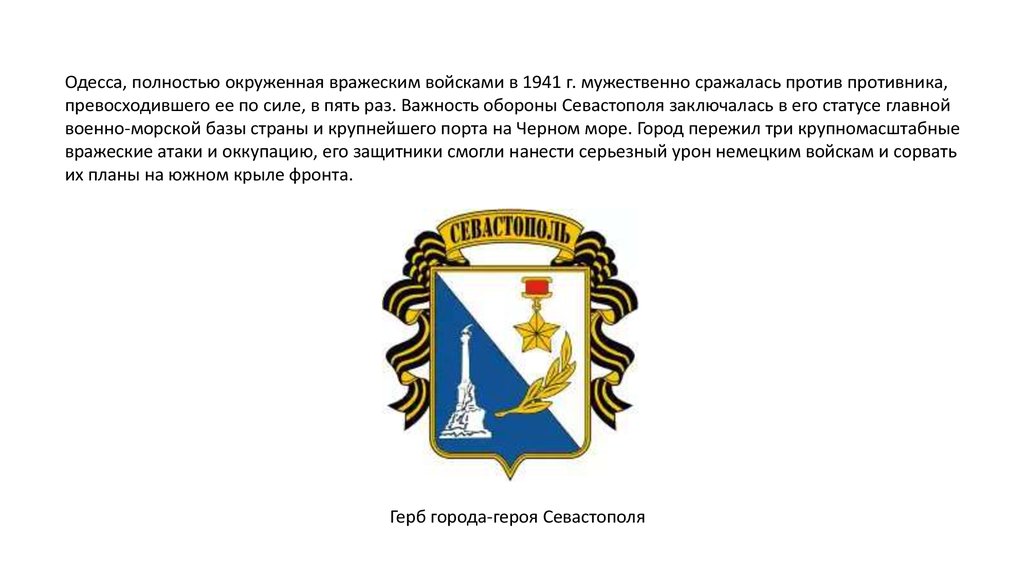 Одесса, полностью окруженная вражеским войсками в 1941 г. мужественно сражалась против противника,превосходившего ее по силе, в пять раз. Важность обороны Севастополя заключалась в его статусе главной