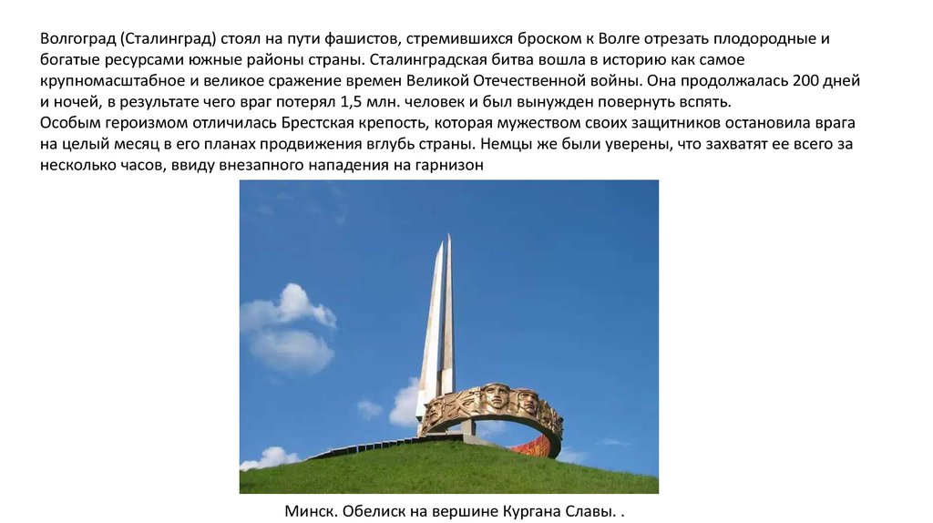 Волгоград (Сталинград) стоял на пути фашистов, стремившихся броском к Волге отрезать плодородные ибогатые ресурсами южные районы страны. Сталинградская битва вошла в историю как самое