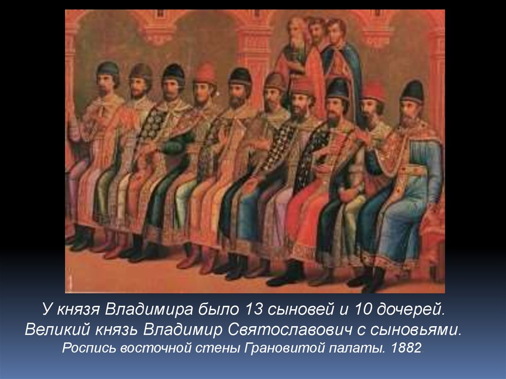 У князя Владимира было 13 сыновей и 10 дочерей.Великий князь Владимир Святославович с сыновьями.