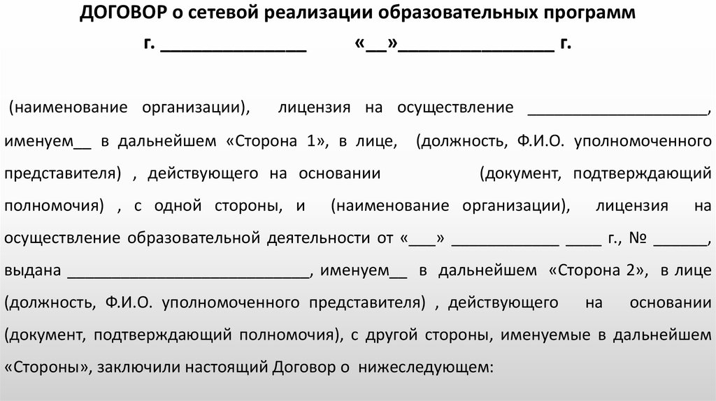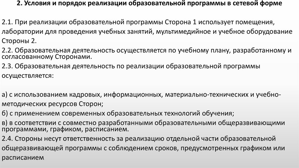 2. Условия и порядок реализации образовательной программы в сетевой форме2.1. При реализации образовательной программы Сторона 1 использует помещения,