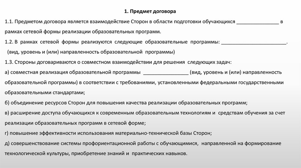 1. Предмет договора1.1. Предметом договора является взаимодействие Сторон в области подготовки обучающихся _______________ в