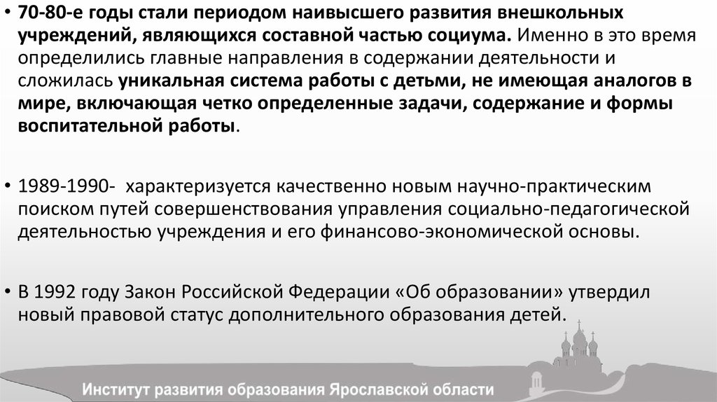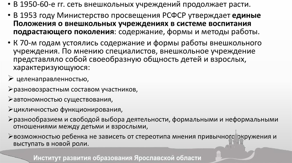 • В 1950-60-е гг. сеть внешкольных учреждений продолжает расти.• В 1953 году Министерство просвещения РСФСР утверждает единые