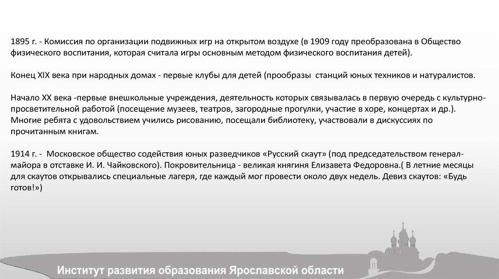 1914 г. - Московское общество содействия юных разведчиков «Русский скаут» (под председательством генералмайора в отставке И. И. Чайковского). Покровительница - великая княгиня Елизавета Федоровна.( В летние месяцы