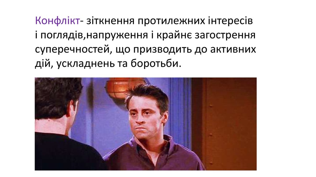 Конфлікт- зіткнення протилежних інтересіві поглядів,напруження і крайнє загострення