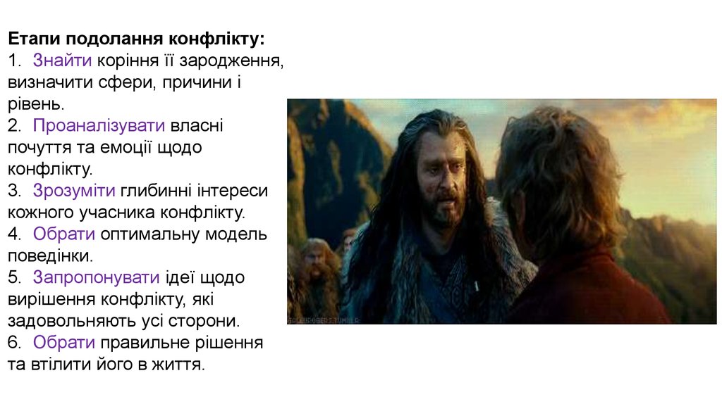 Етапи подолання конфлікту:1. Знайти коріння її зародження,