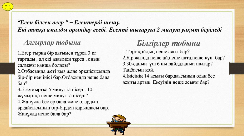 “Есеп білген өсер ” – Есептерді шешу.Екі топқа амалды орындау есебі. Есепті шығаруға 2 минут уақыт беріледі