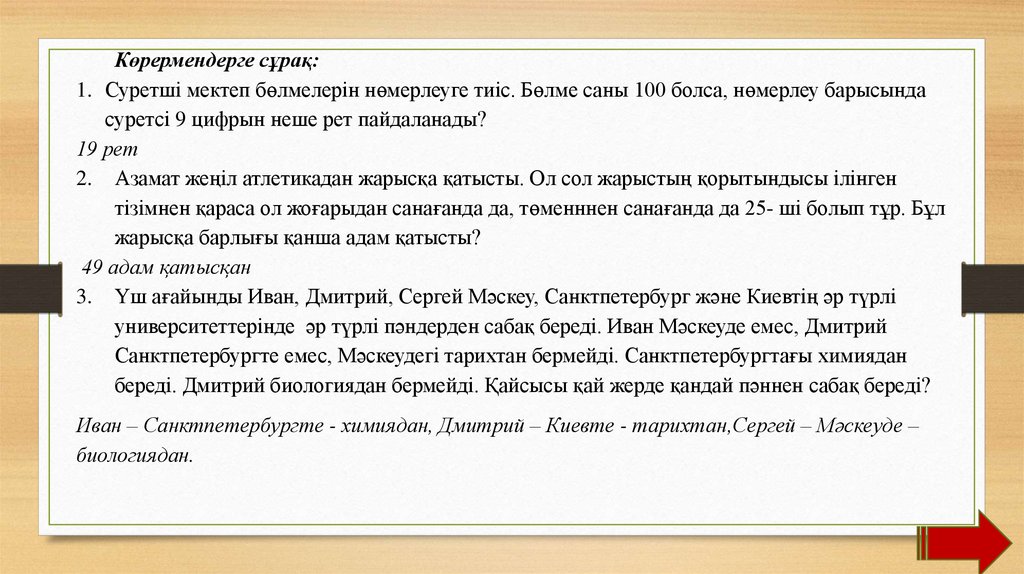 Көрермендерге сұрақ:1. Суретші мектеп бөлмелерін нөмерлеуге тиіс. Бөлме саны 100 болса, нөмерлеу барысында