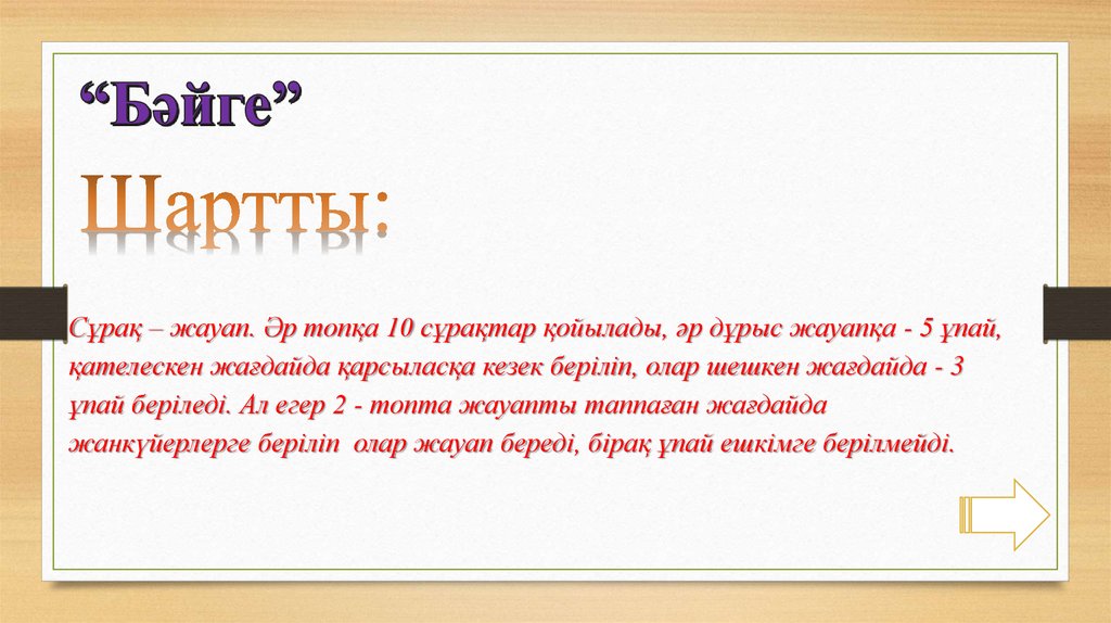 Сұрақ – жауап. Әр топқа 10 сұрақтар қойылады, әр дұрыс жауапқа - 5 ұпай,қателескен жағдайда қарсыласқа кезек беріліп, олар шешкен жағдайда - 3