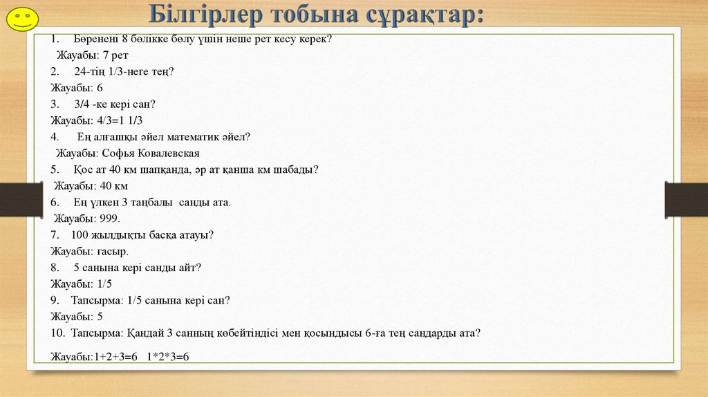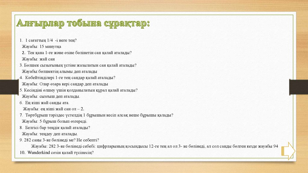 1. 1 сағаттың 1/4 -і неге тең?Жауабы: 15 минутқа