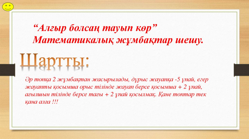 Әр топқа 2 жұмбақтан жасырылады, дұрыс жауапқа -5 ұпай, егер