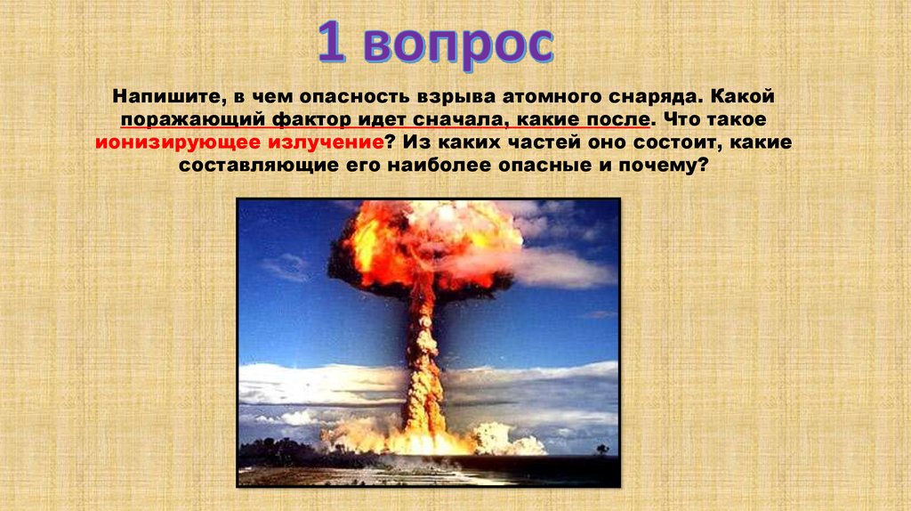 Напишите, в чем опасность взрыва атомного снаряда. Какойпоражающий фактор идет сначала, какие после. Что такое
