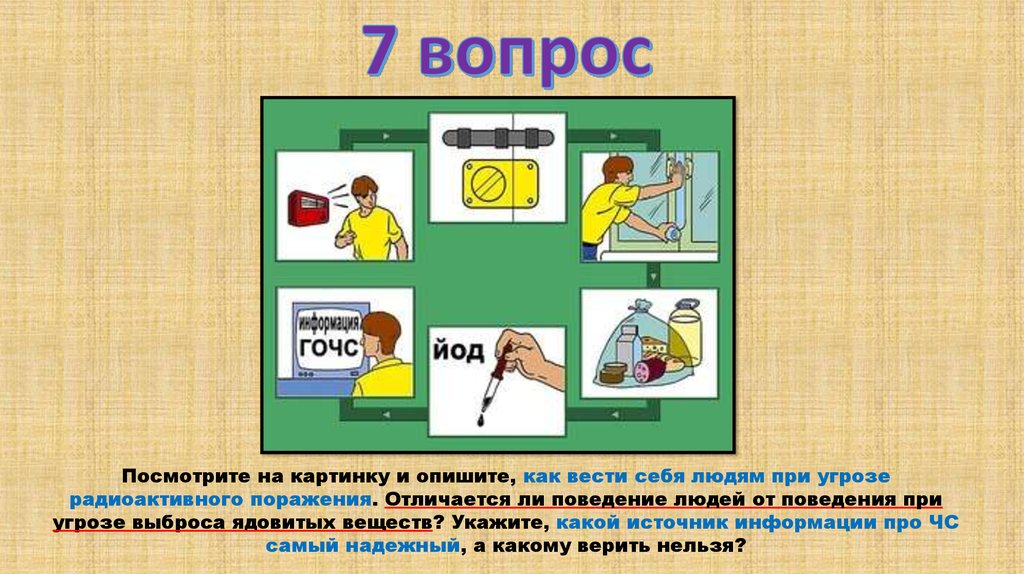 Посмотрите на картинку и опишите, как вести себя людям при угрозерадиоактивного поражения. Отличается ли поведение людей от поведения при