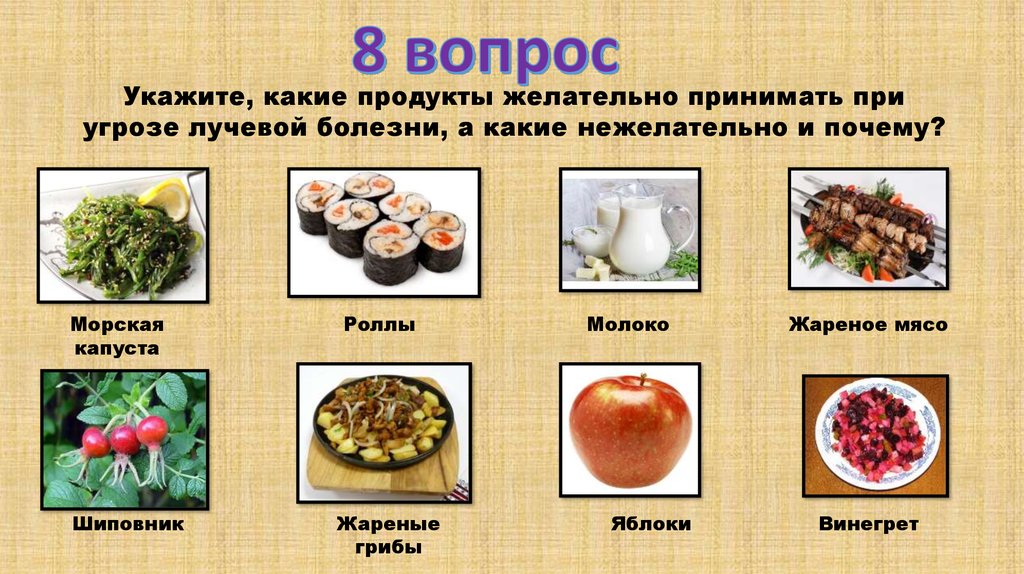 Укажите, какие продукты желательно принимать приугрозе лучевой болезни, а какие нежелательно и почему?