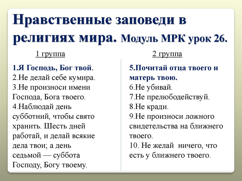 Нравственные заповеди врелигиях мира. Модуль МРК урок 26.