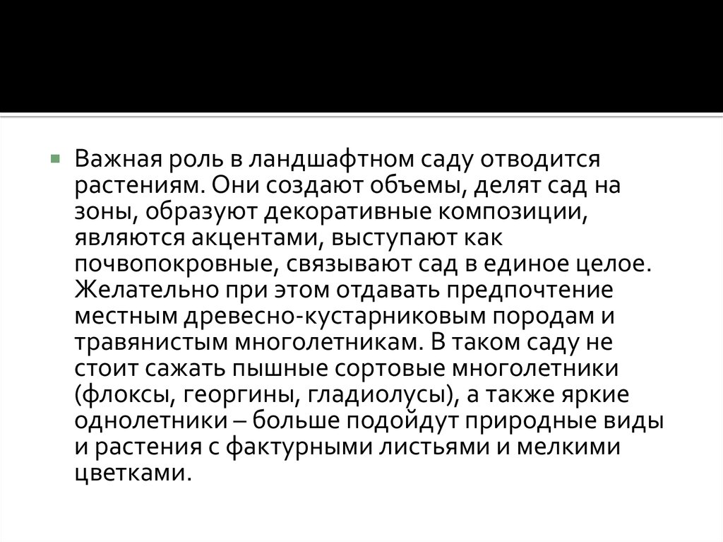 Важная роль в ландшафтном саду отводитсярастениям. Они создают объемы, делят сад на