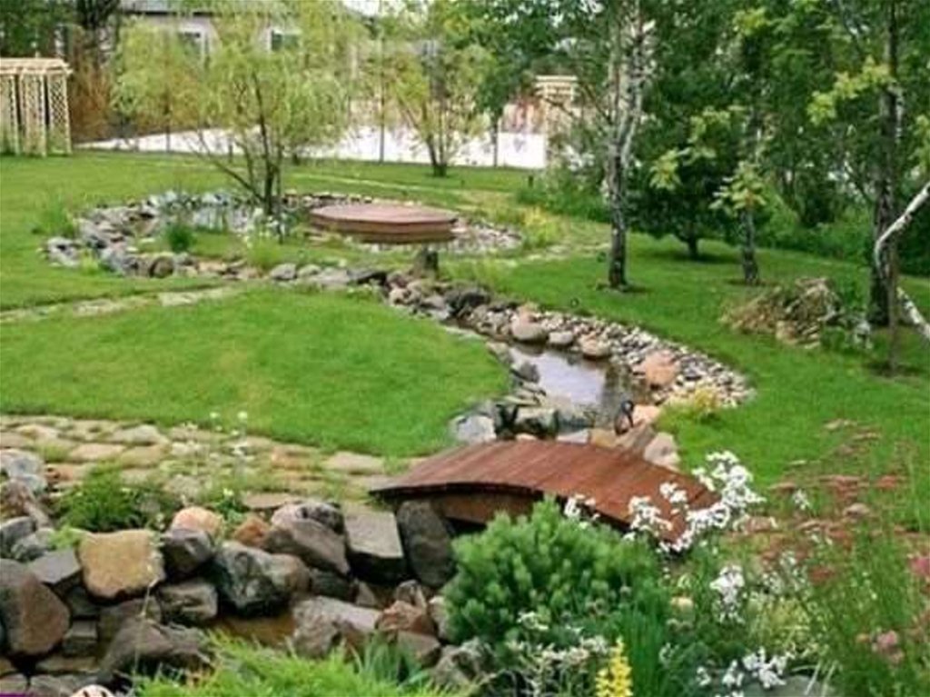цветники, альпинарии, водоемы, беседки. Ближе к