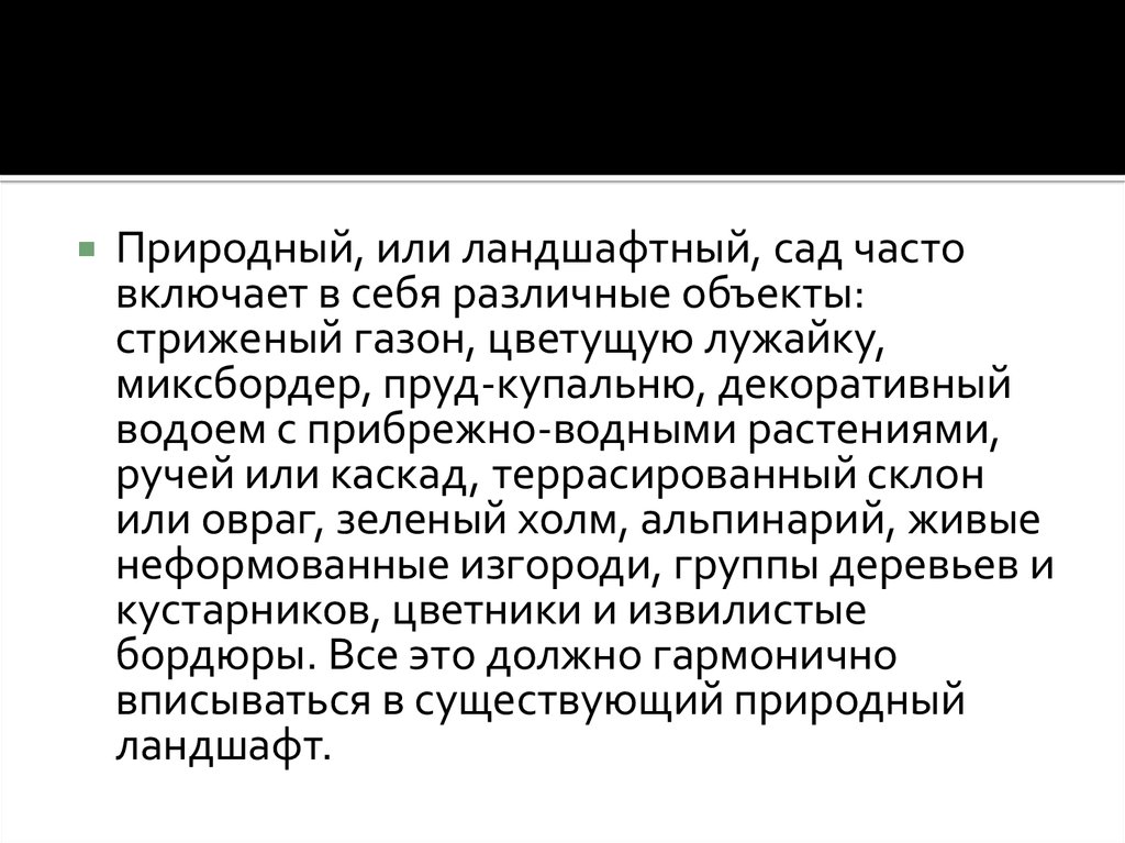 Природный, или ландшафтный, сад частовключает в себя различные объекты: