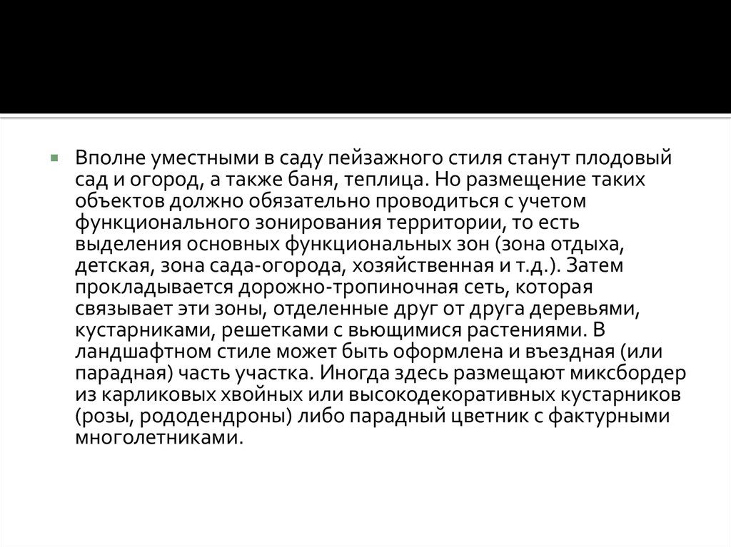 Вполне уместными в саду пейзажного стиля станут плодовыйсад и огород, а также баня, теплица. Но размещение таких