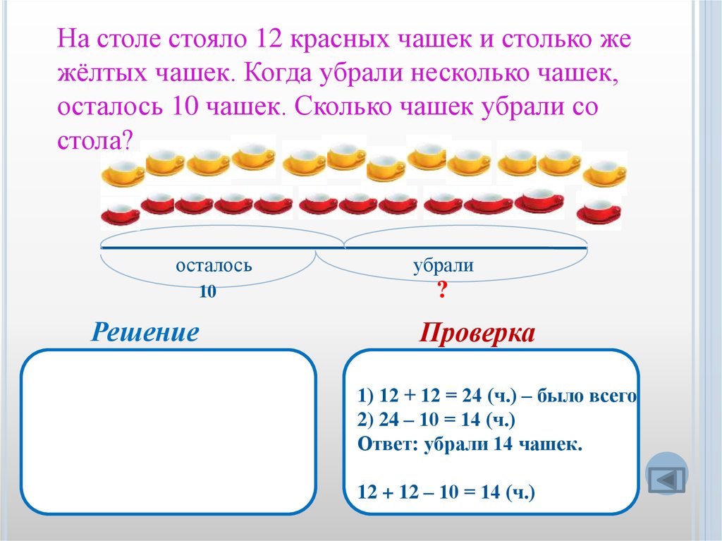 На столе стояло 12 красных чашек и столько жежёлтых чашек. Когда убрали несколько чашек,