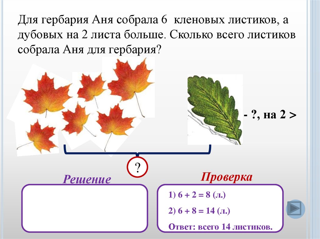 Для гербария Аня собрала 6 кленовых листиков, адубовых на 2 листа больше. Сколько всего листиков