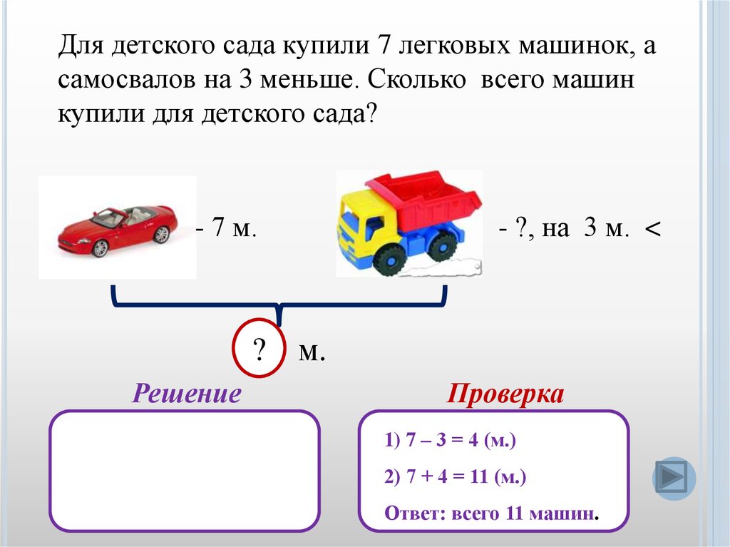 Для детского сада купили 7 легковых машинок, асамосвалов на 3 меньше. Сколько всего машин