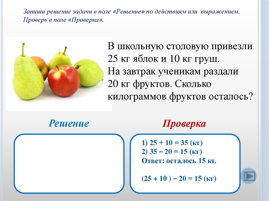 Запиши решение задачи в поле «Решение» по действиям или выражением.Проверь в поле «Проверка».