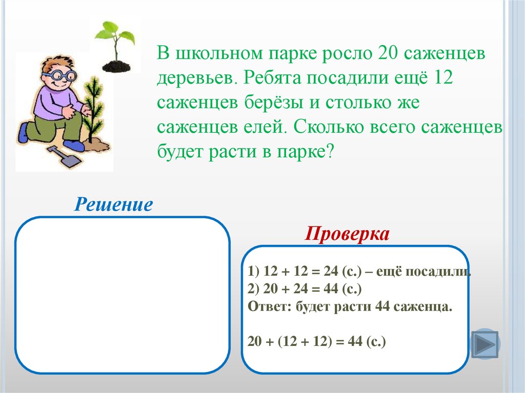 1) 12 + 12 = 24 (с.) – ещё посадили.