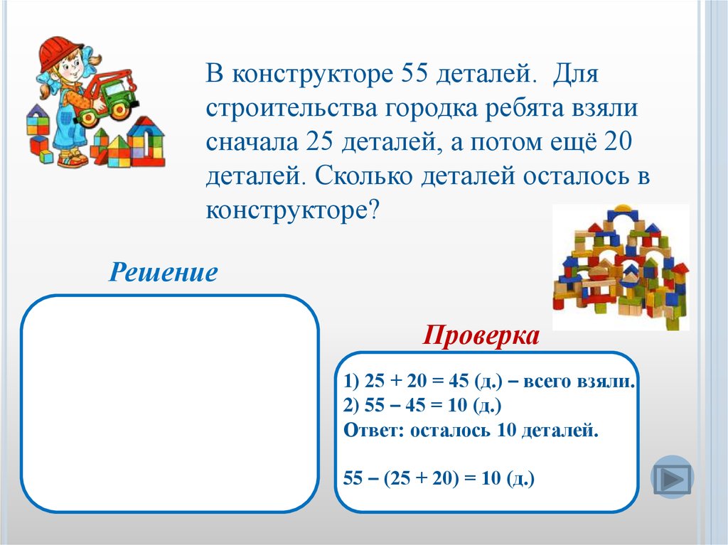 В конструкторе 55 деталей. Длястроительства городка ребята взяли