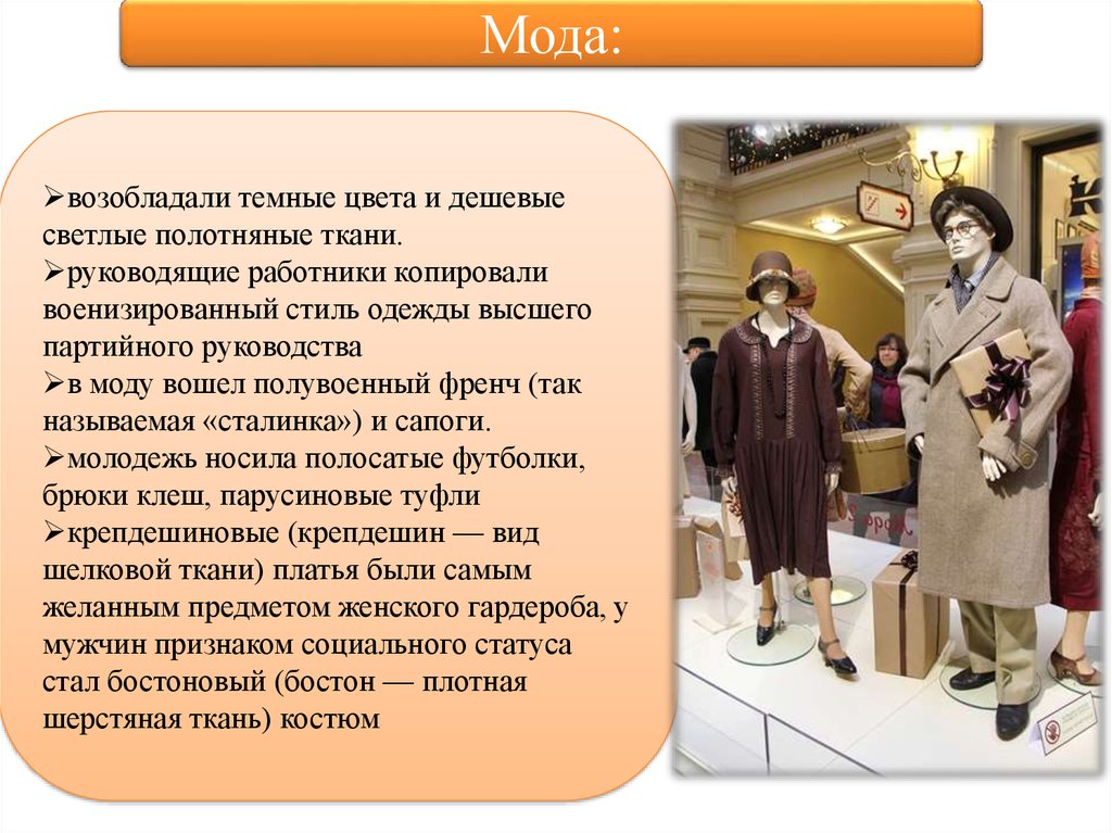 В моду вошел полувоенный френч (так называемая «сталинка») и сапоги.