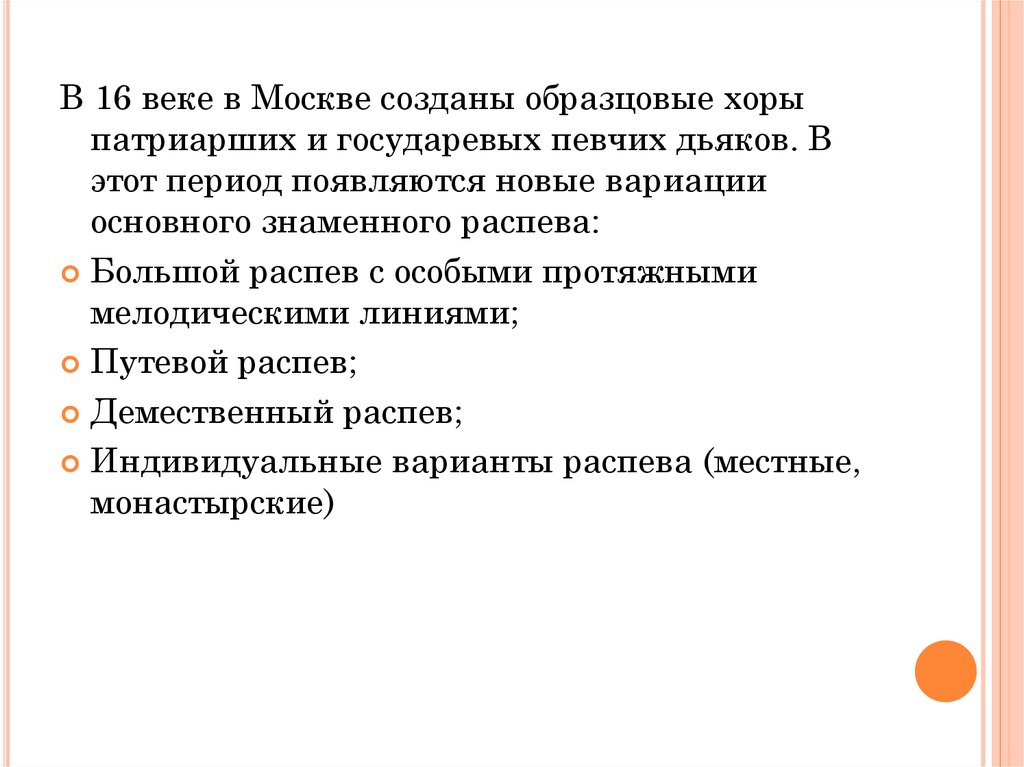 В 16 веке в Москве созданы образцовые хорыпатриарших и государевых певчих дьяков. В