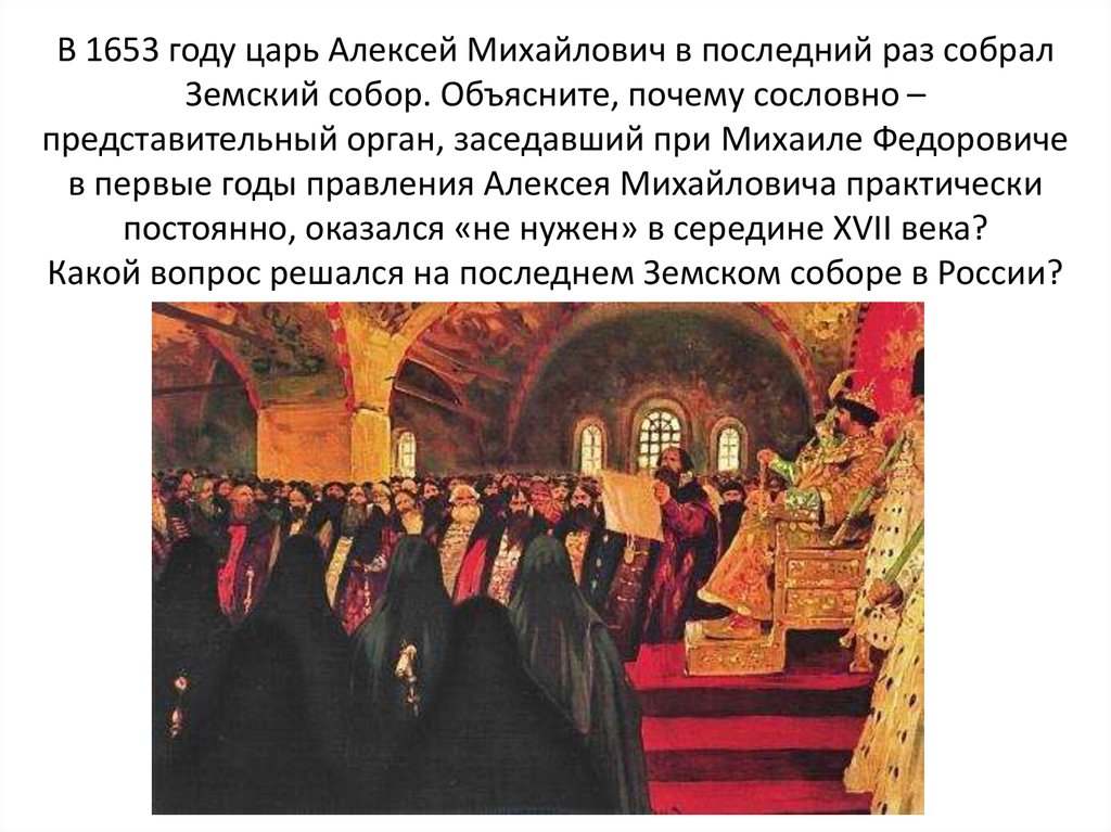 В 1653 году царь Алексей Михайлович в последний раз собралЗемский собор. Объясните, почему сословно –