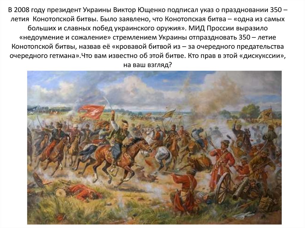 В 2008 году президент Украины Виктор Ющенко подписал указ о праздновании 350 –летия Конотопской битвы. Было заявлено, что Конотопская битва – «одна из самых