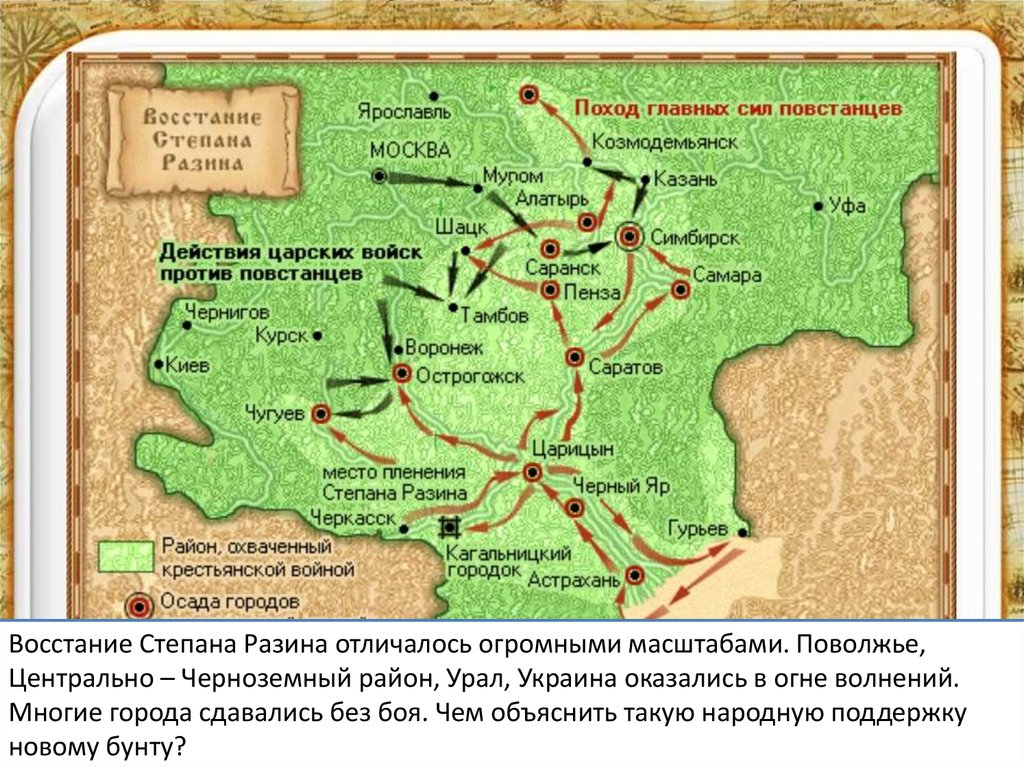 Восстание Степана Разина отличалось огромными масштабами. Поволжье,Центрально – Черноземный район, Урал, Украина оказались в огне волнений.