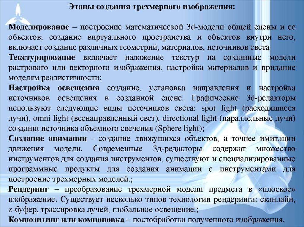 Этапы создания трехмерного изображения:Моделирование – построение математической 3d-модели общей сцены и ее