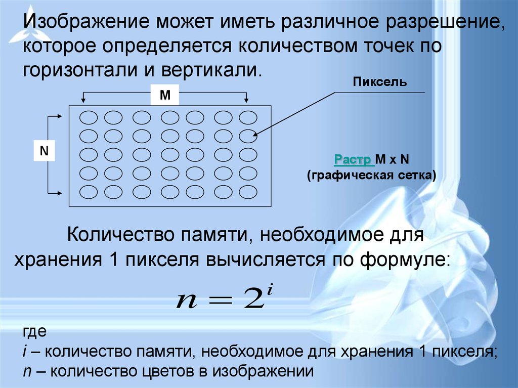 i – количество памяти, необходимое для хранения 1 пикселя;