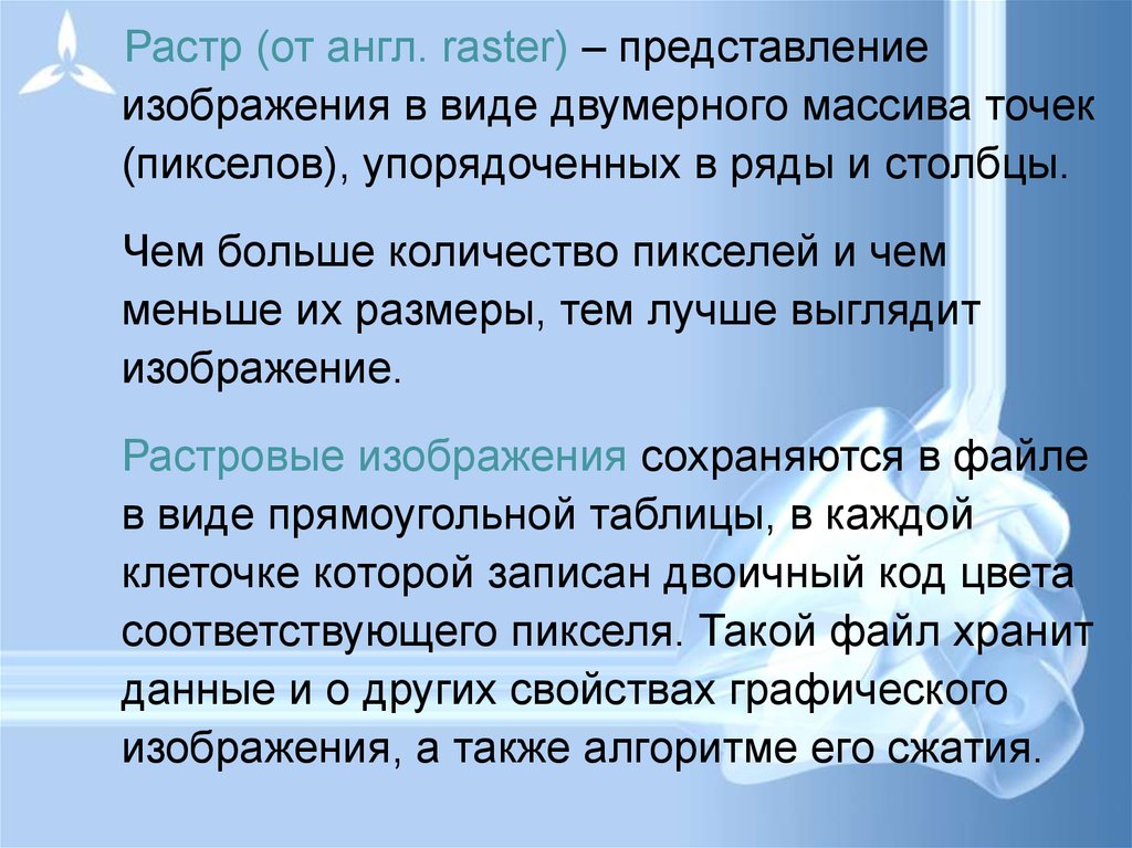Растр (от англ. raster) – представлениеизображения в виде двумерного массива точек
