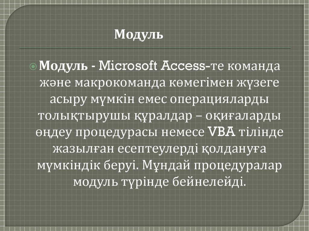 деректерге мүмкіндік беретін беттер, макростар және модульдер.