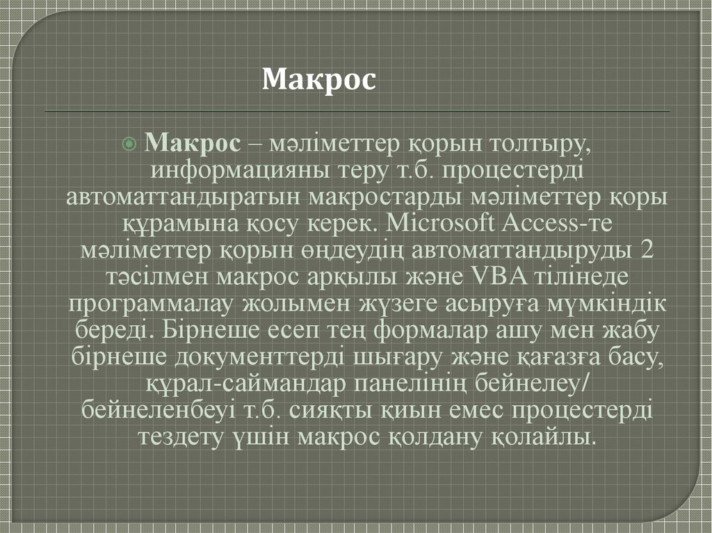 кейін формалар, есептер және де макростар көмегімен сіз осы