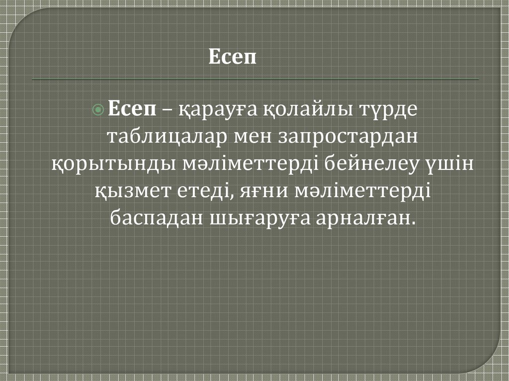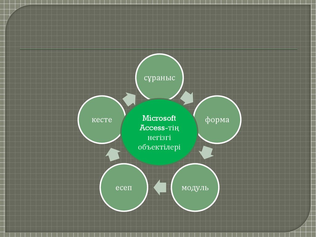 компонеттерден тұрады. Олар: кесте, форма, есеп беру, сұраныстар,