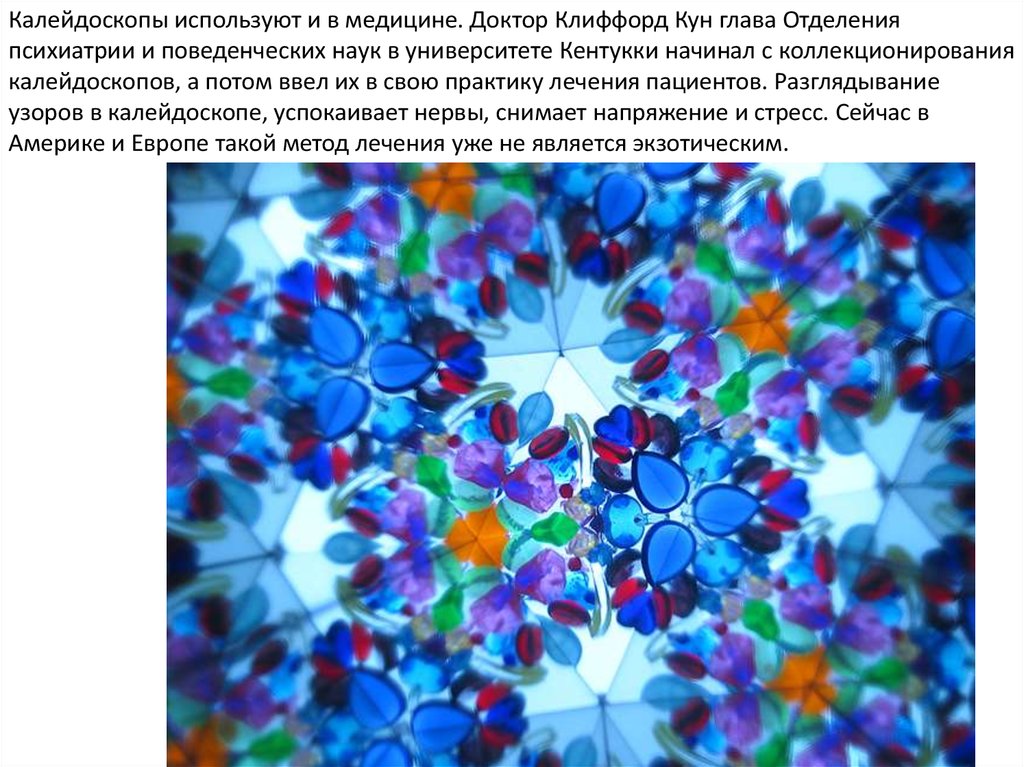 Калейдоскопы используют и в медицине. Доктор Клиффорд Кун глава Отделенияпсихиатрии и поведенческих наук в университете Кентукки начинал с коллекционирования