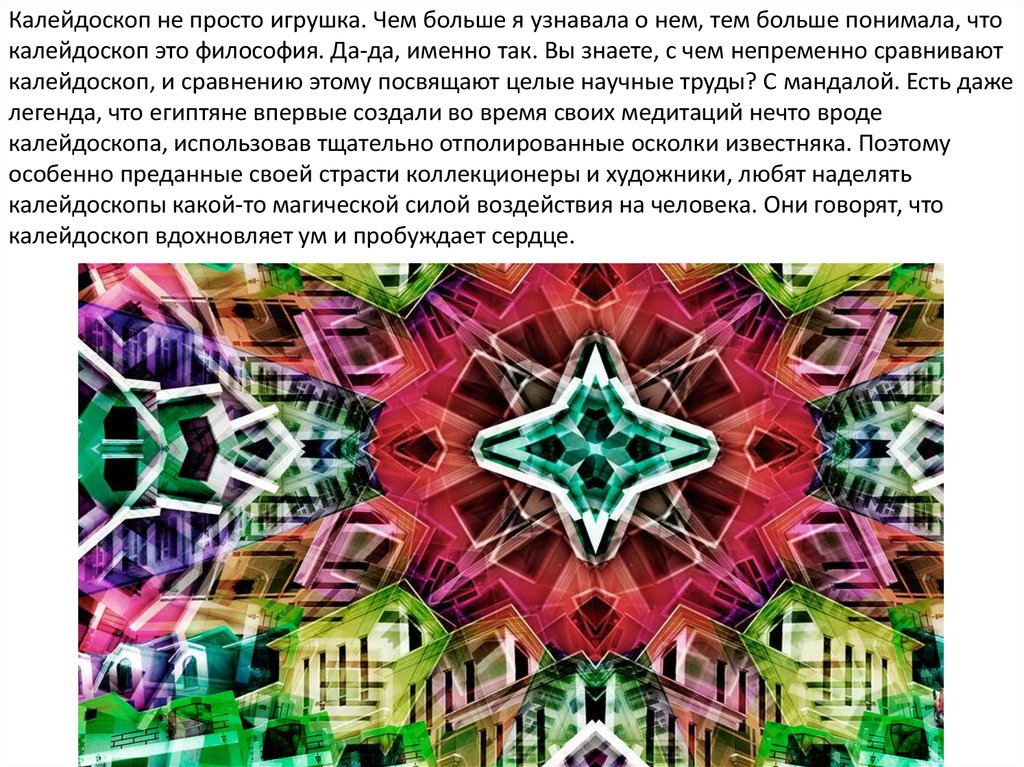 Калейдоскоп не просто игрушка. Чем больше я узнавала о нем, тем больше понимала, чтокалейдоскоп это философия. Да-да, именно так. Вы знаете, с чем непременно сравнивают