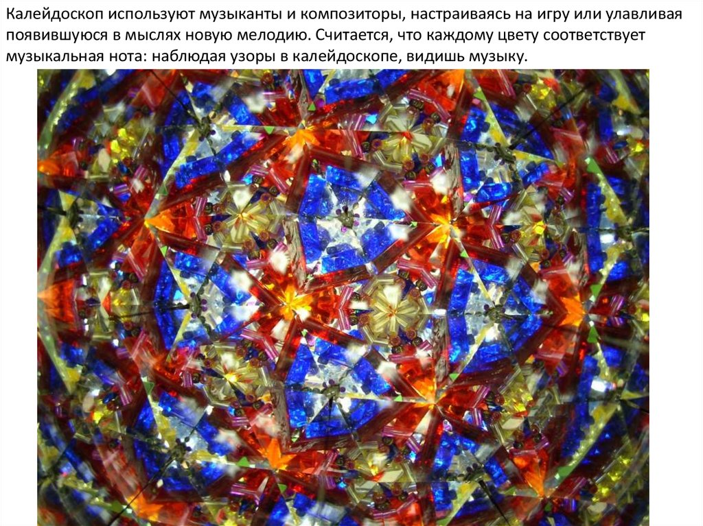 Калейдоскоп используют музыканты и композиторы, настраиваясь на игру или улавливаяпоявившуюся в мыслях новую мелодию. Считается, что каждому цвету соответствует