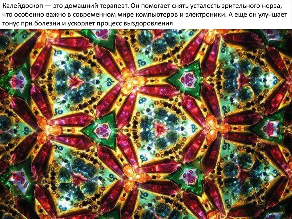 Калейдоскоп — это домашний терапевт. Он помогает снять усталость зрительного нерва,что особенно важно в современном мире компьютеров и электроники. А еще он улучшает