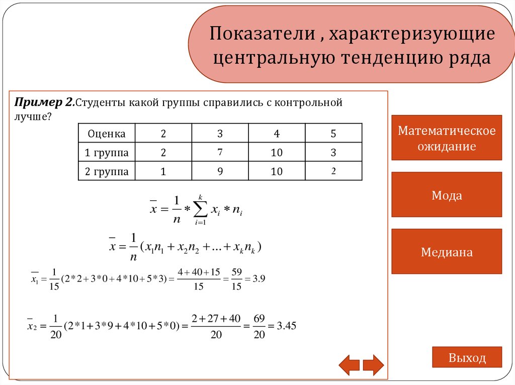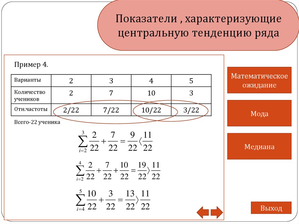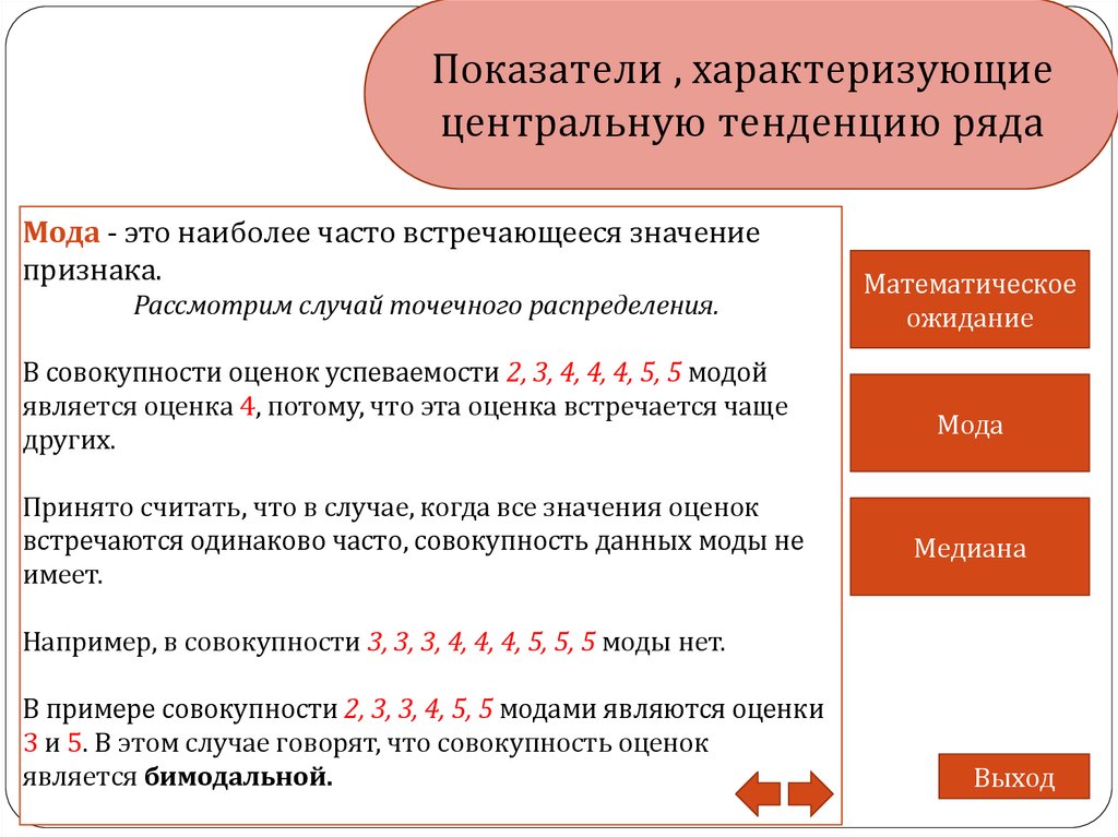В совокупности оценок успеваемости 2, 3, 4, 4, 4, 5, 5 модой