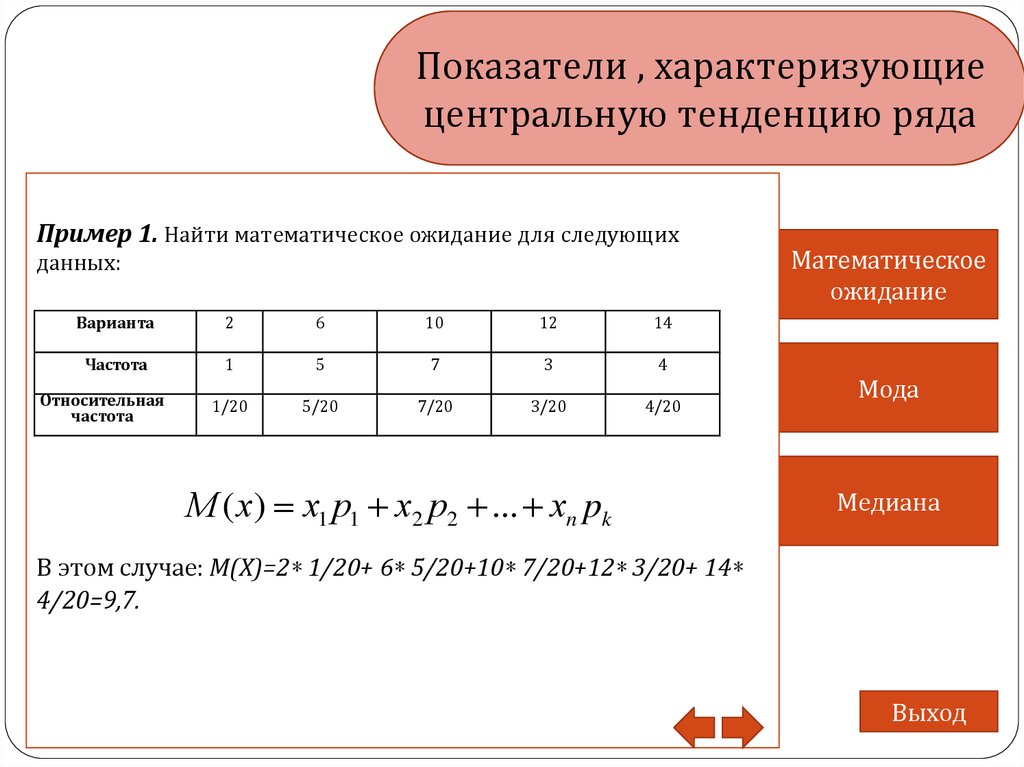 В этом случае: М(Х)=2* 1/20+ 6* 5/20+10* 7/20+12* 3/20+ 14*